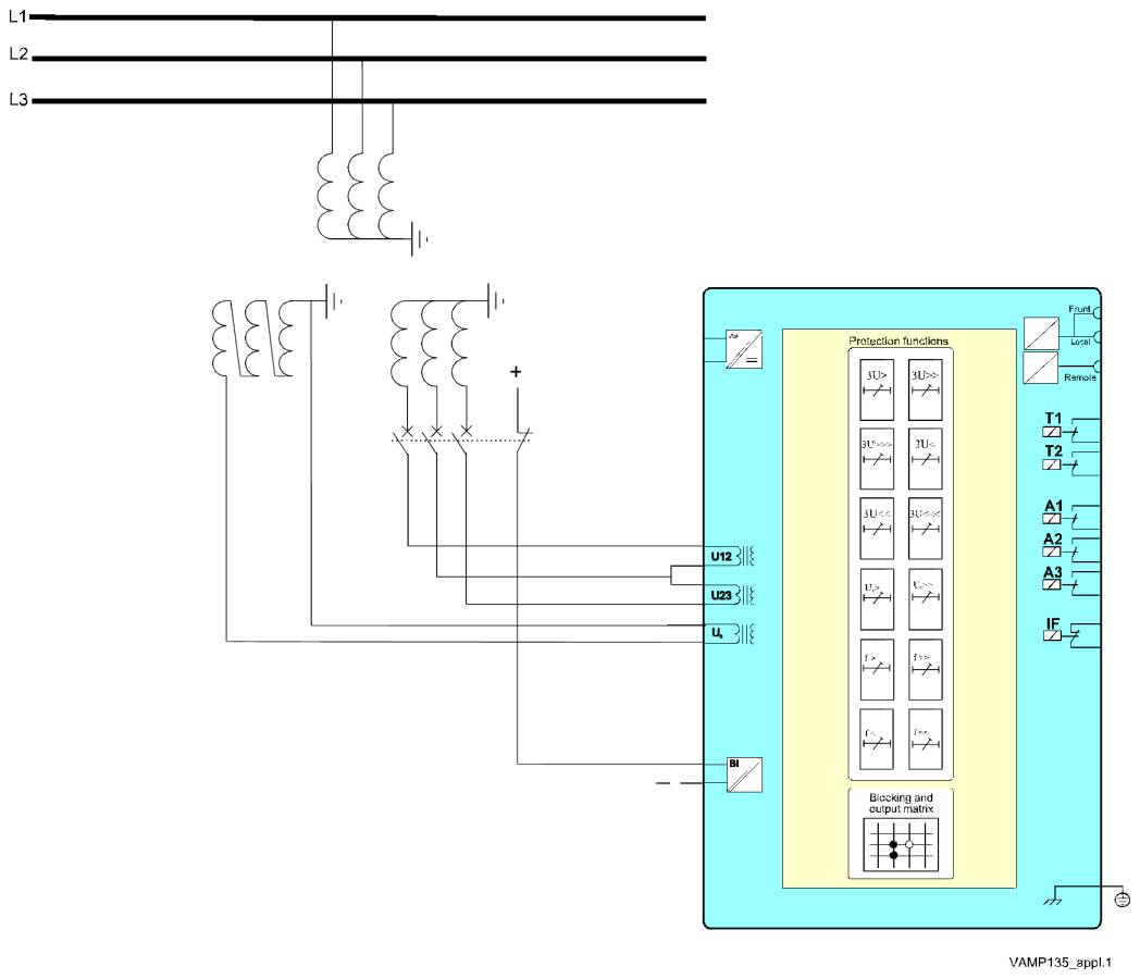 - The relay is connected to main voltages U12, U23 and to a residual voltage U0.