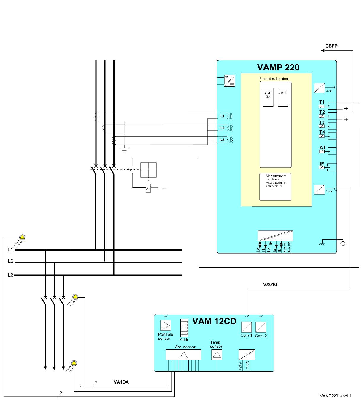 VAMP 220 is a modular system composed of a master unit, slave units, arc sensors, temperature sensors and possible trip multiplying units and interface units.